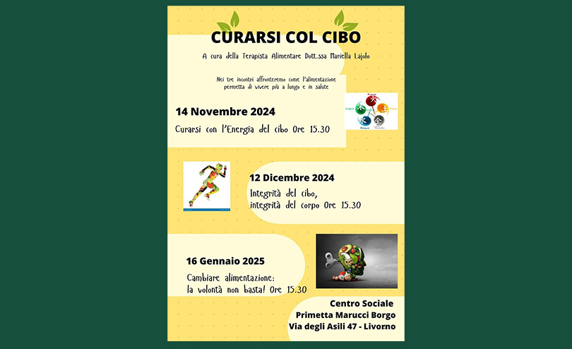 Come Benessere Integrale 360, tra novembre 2024 e gennaio 2025, ho organizzato un ciclo di incontri: “Curare col cibo”, presso il Centro Sociale Primetta Marucci Borgo a Livorno. Nel corso del primo incontro i partecipanti sono stati stimolati a riconoscere il potere di orientare la loro salute in direzione del benessere o della malattia, attraverso lo stile di vita, la dieta e i rimedi casalinghi. Di conseguenza sono stati invitati ad assumersi la responsabilità di creare un circolo virtuoso, se desiderano alleggerire il corpo e la mente.
